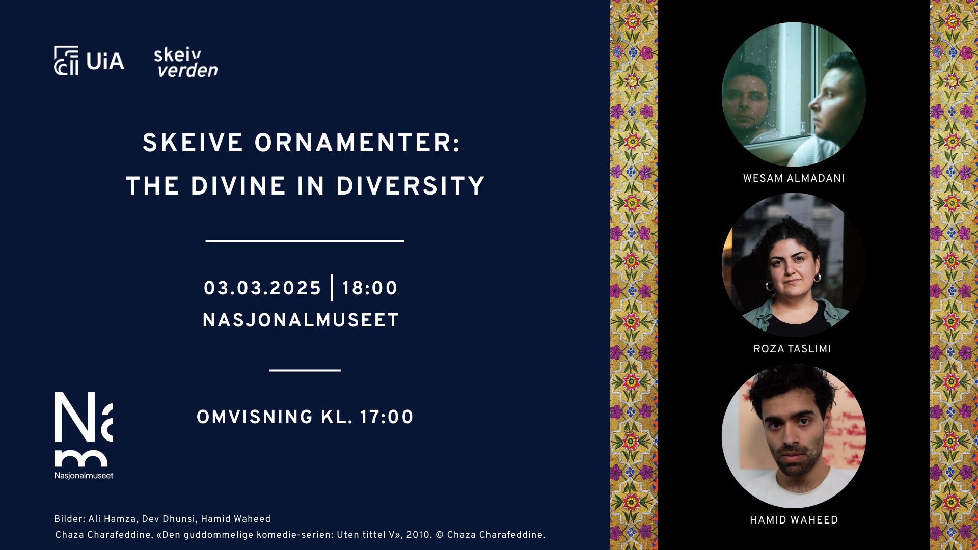 I forbindelse med utstillingen Skeive ornamenter inviterer Skeiv Verden, Senter for Likestilling ved Universitetet i Agder og Nasjonalmuseet til en ledet kuratoromvisning og en samtale om hvordan kunst kan åpne rom for skeive erfaringer med tilknytning til islam. Samtalen foregår på Nasjonalmuseets bibliotek.